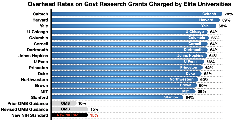 1. The 60% Innovation Tax: Harvard, Yale, and Johns Hopkins charge a 60%+ overhead rate on research grants. Most funding feeds bureaucracy, not breakthroughs.