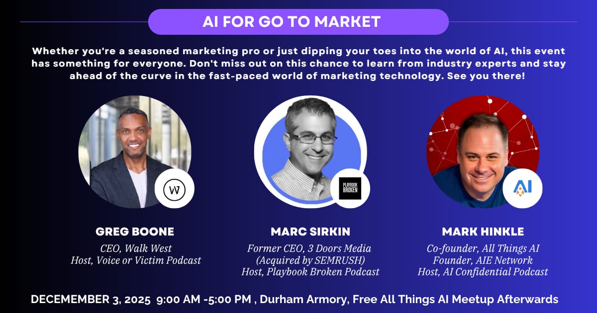 On December 3 in Durham, join Greg Boone (Walk West), Marc Sirkin (ex-Third Door Media), and Mark Hinkle (Peripety Labs / All Things AI) for a hands-on working session on wiring AI directly into your GTM engine — pipeline, conversion, retention, and efficiency included.