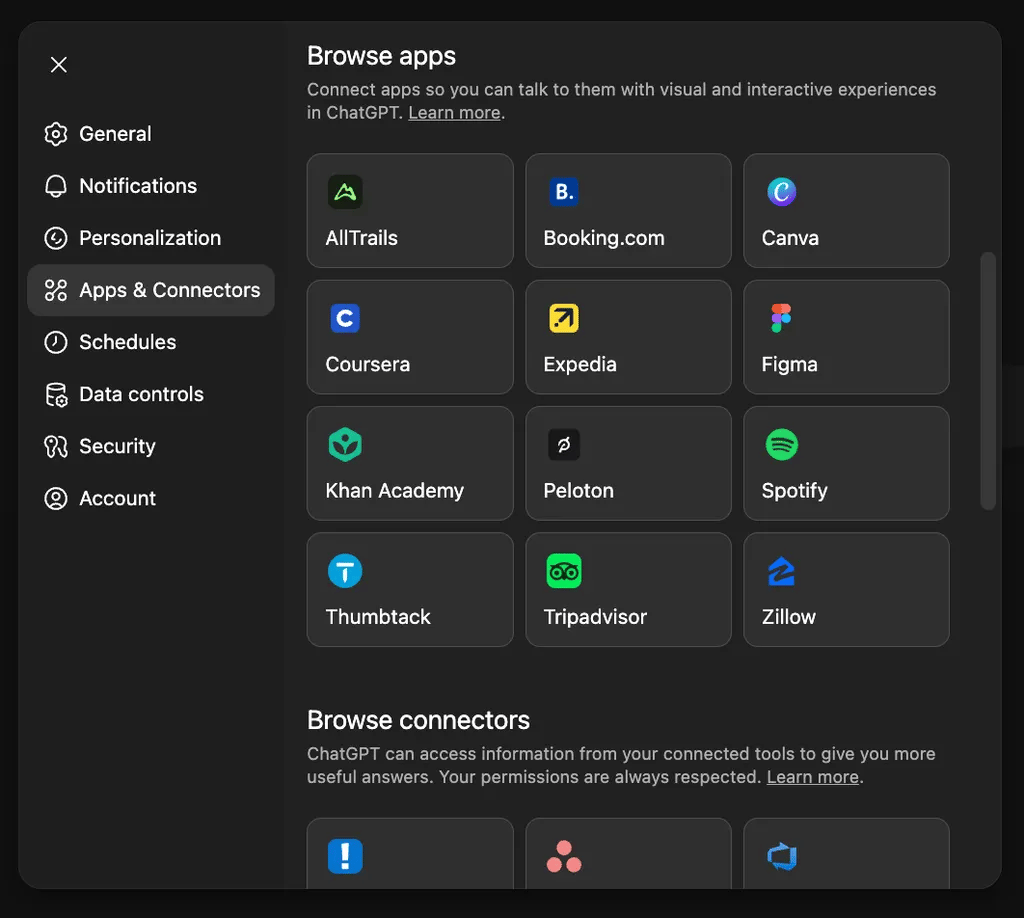 Connectors let ChatGPT securely interact with third-party applications like: